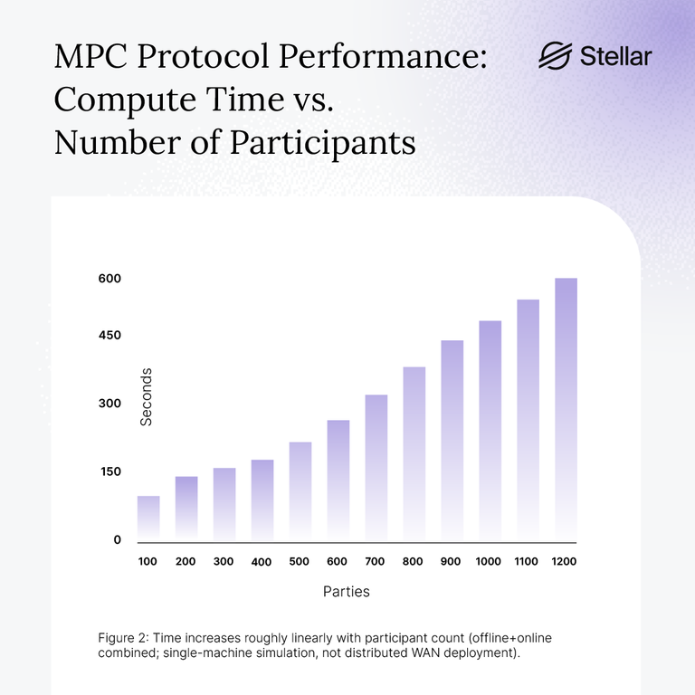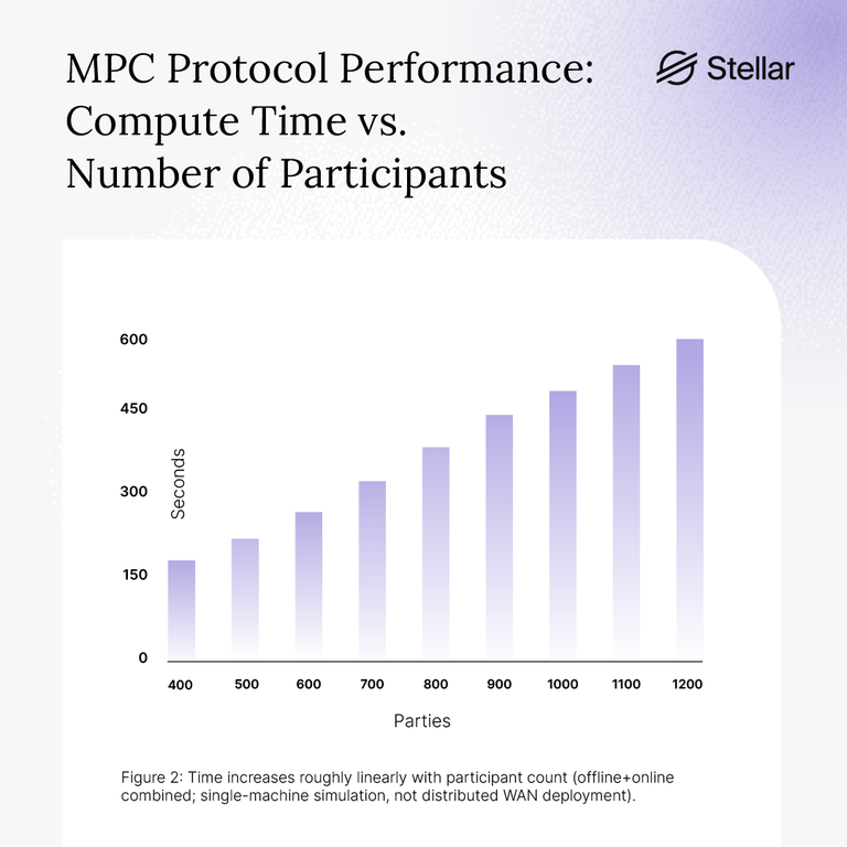 We also measured how time increases with participant count for a single round. Here too we see roughly linear growth—around 100 seconds for 100 participants, climbing to about 600 seconds for 1,200 participants.