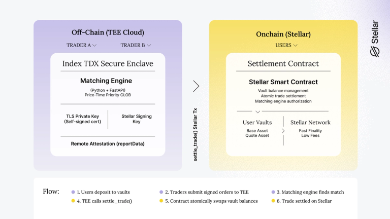 The system has two components working in tandem. Off-chain, a Python matching engine runs inside the TEE, receiving signed orders via REST API and maintaining a private order book with price-time priority matching. Onchain, a Stellar smart contract manages user vault balances and executes atomic transfers when trades settle.