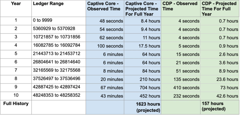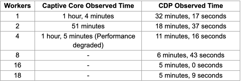 In this evaluation, Captive Core ran with 2 parallel workers, while CDP ran with 16 parallel workers.