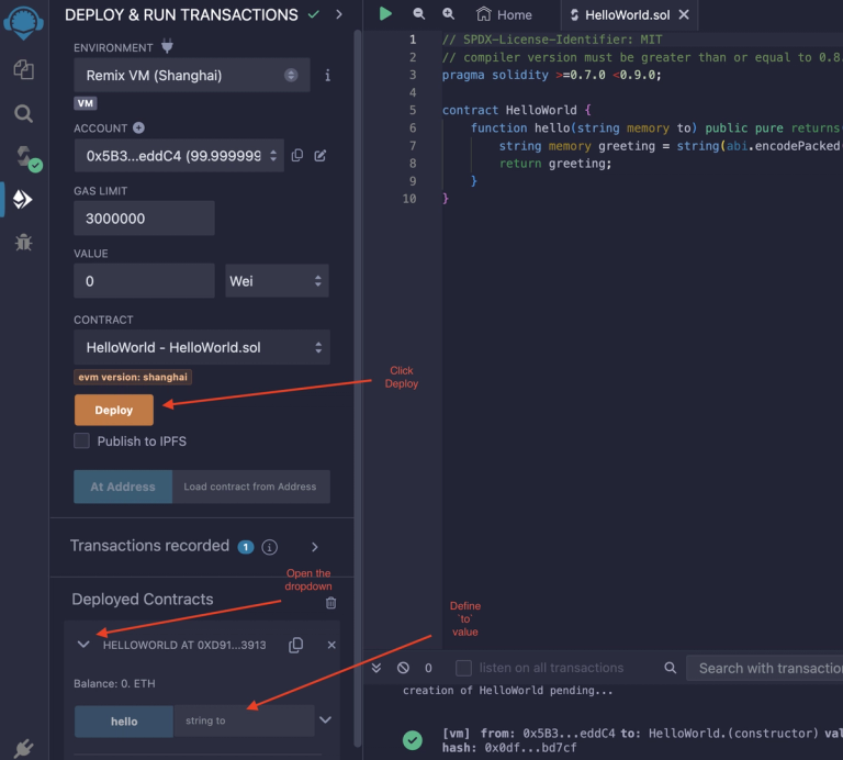 Without changing any of the values as shown above just click the “Deploy” button to deploy your smart contract. Once deployed you will find your smart contract just below in “Deployed Contracts” heading.