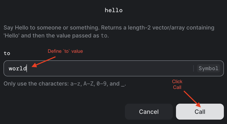 Pass in an value for `to` and click the “call” button