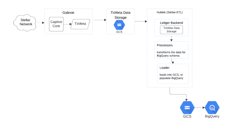 Before Galexie, Hubble, the Stellar Analytics Platform, used Captive Core to ingest data from the Network. For batch processing, this was resource-intensive because Captive Core’s catch-up phase took longer than reading and processing that batch of data from the Network. By leveraging a data lake, Hubble is decoupled from Captive Core, meaning it can access transaction metadata directly from GCS without incurring the expensive startup cost of Captive Core. This significantly reduces execution time and overhead.