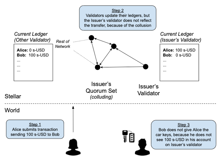 At first glance, this seems like Issuer is in trouble because Bob is going to be very angry when he realizes that Issuer does not think he has 100 s-USD and therefore can’t redeem. But there’s a simple solution: Issuer makes clear to the world that nobody should believe they have s-USD unless Issuer’s validator says they do. As long as Issuer makes that clear, Bob won’t give Alice the car until he sees 100 s-USD in his account on Issuer’s validator.