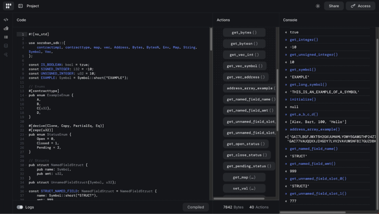 An online IDE platform designed to create an accessible environment for web developers to experiment with Soroban. With an in-browser host environment, it allows for immediate viewing of contract call outcomes and ledger changes and executes complex transactions involving multiple accounts and contracts. This setup aims to minimize onboarding challenges, particularly reducing the time-to-interaction, which is crucial for retaining web developers in the blockchain field. Learn more in their SCF submission.