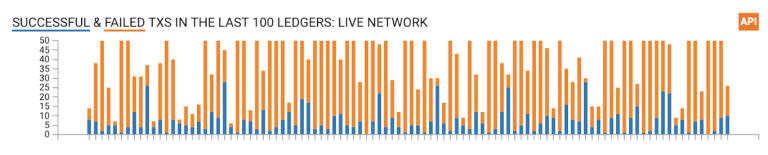 Here’s a snapshot of the last 200 ledgers as of writing these lines, from the Stellar dashboard. As you can see, about a quarter of the ledgers are maxed out at 50 transactions: