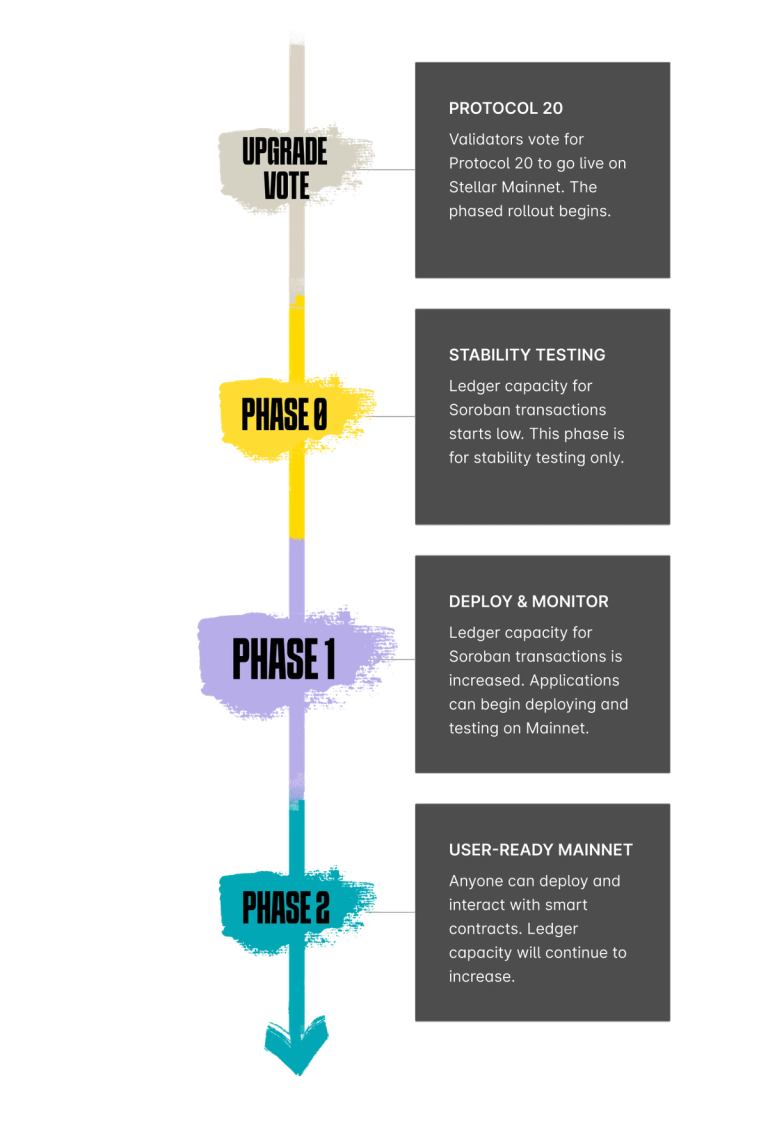Protocol 20 will mark the most transformative upgrade to the Stellar network to date. And to preserve the network's performance, security, and stability during this time, the ecosystem has agreed that a slow and steady process makes a lot of sense. So, following the vote, validators will deploy a phased approach to gradually and responsibly increase capacity for Soroban transactions to monitor the impact of smart contract functionality on the network.