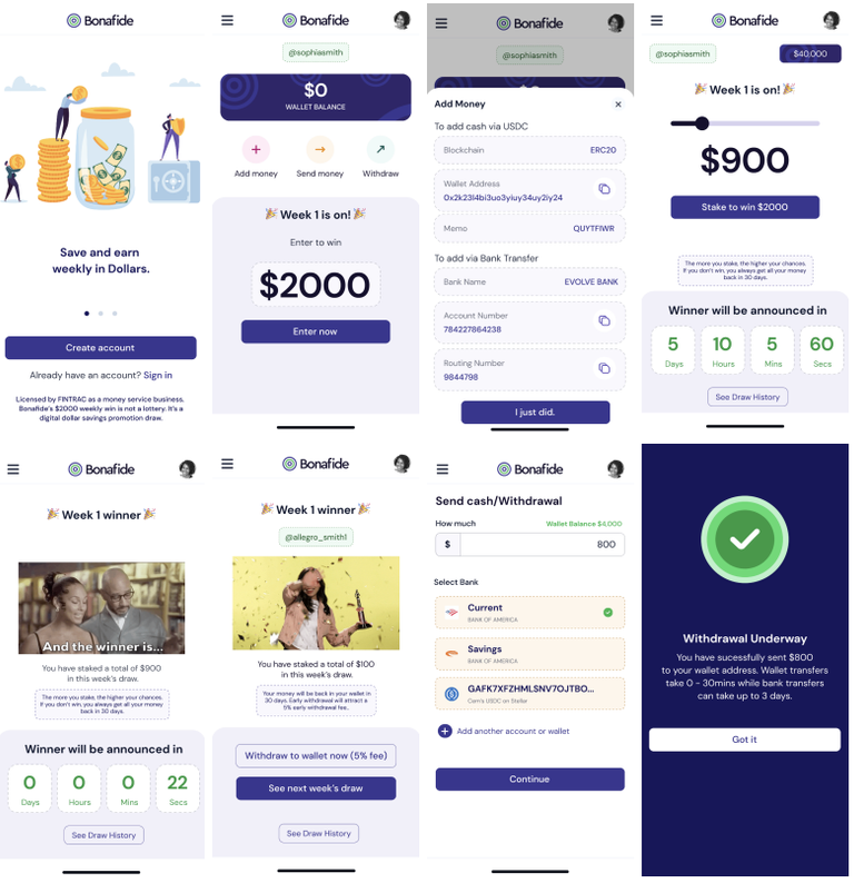 Bonafide is a wallet that lets users save and win prizes weekly in dollars. During the bootcamp, they built a dollar savings app for the African Diaspora, since Stellar provides them with the ability to spin up USDC wallets affordably. Bonafide aims to evolve into a digital dollar wallet that allows Africans to send, receive, save and invest money.