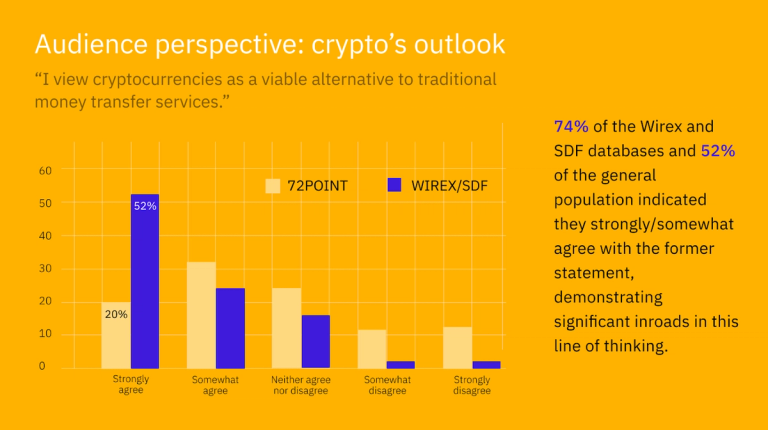 What is even more striking is how people are not just holding cryptocurrency; rather, they view cryptocurrencies as a viable alternative to traditional money transfer services. 74% of the Wirex and SDF databases and 52% of the general population indicated they strongly/somewhat agree with the former statement, demonstrating significant inroads in this line of thinking.