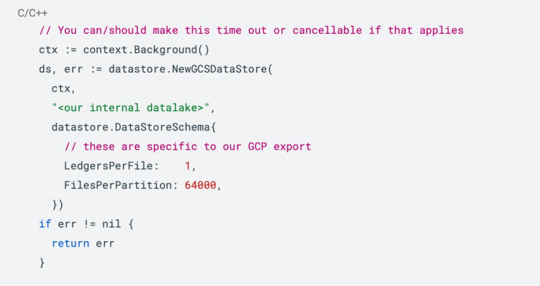 Primero, necesitamos un almacén de datos de metadatos del libro mayor. Admito que hice un poco de trampa en esta parte ya que el equipo ya había exportado todo a nuestro cubo de GCS y no tuve que hacer ninguna exportación yo mismo. Pero una vez que CDP despegue, no me sorprendería ver a los proveedores del ecosistema permitir el acceso a sus lagos de datos a los desarrolladores de una manera similar a lo que vemos con RPC. También es importante recordar que CDP es un modelo de "exportar un rango una vez, ingerirlo en todas partes" (a diferencia de Horizon que necesita un núcleo cautivo para generar datos sobre la marcha y luego ingerirlos cada vez para cualquier rango que quieras rellenar), así que incluso si decides ejecutar galexie para construir el lago de datos tú mismo, solo tendrás que lidiar con el proceso de exportación una vez, en lugar de cada vez.