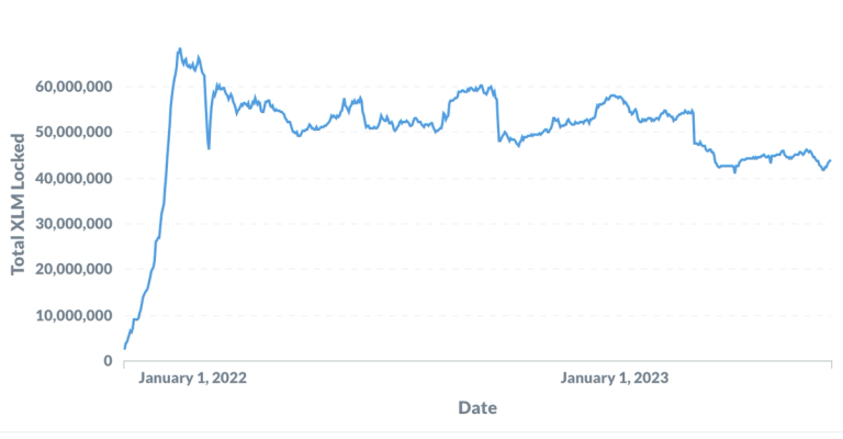 A julio de 2023, actualmente hay ~45M XLM bloqueados en todos los fondos de liquidez en la red de Stellar. Al trazar el valor total bloqueado a lo largo del tiempo, es fácil observar cuándo se lanzaron los AMMs y entender cómo XLM impacta la liquidez en todos los fondos.
