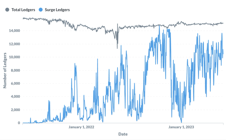 group by close_dateUsando Hubble, podemos perfilar las estadísticas de tarifas sobre una ventana de tiempo mucho mayor que Horizon. Horizon solo devuelve estadísticas de tarifas para los últimos 5 ledgers, y Hubble permite al usuario agregar datos sobre la historia completa: ¡46 millones de ledgers y contando! Perfilar los datos sobre una ventana más grande permite al usuario observar cualquier periodicidad de alta actividad en la red, optimizar estrategias de tarifas y predecir costos de transacciones futuras. Analizamos los últimos dos años de datos, y es obvio que las presentaciones de transacciones a la red están aumentando. Más del 60% de todos los ledgers cerrados entre marzo de 2023 y junio de 2023 experimentaron tarificación dinámica.