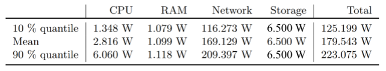 Una incertidumbre similar existe cuando se trata de las mediciones de energía de CPU y RAM. Intuitivamente, las cifras informadas fueron bastante bajas, contribuyendo en promedio con solo menos de 4 W. Sin embargo, al igual que informaron otros nodos validadores, la carga promedio medida de CPU fue de menos del 10 %, con picos altos seguidos por períodos cortos de casi inactividad. Es posible que a cargas de sistema tan bajas, otros componentes del hardware del servidor sean tan significativos como la CPU y la RAM, por lo que sería interesante leer mediciones de un medidor de energía físico, así como mediciones realizadas en una variedad mayor de hardware (un operador de nodo incluso informó que ejecutaba stellar-core en un Raspberry Pi). Nuevamente, aunque la precisión exacta del número es cuestionable, los resultados indican que ni el uso de CPU ni de RAM contribuyen significativamente al consumo de electricidad de la red en este punto.