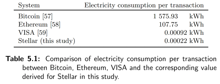 Para poner los números de uso de electricidad por transacción en un contexto, se pueden comparar con servicios similares. Al hacerlo es importante notar que esto es, de cierta manera, comparar manzanas con peras. Por ejemplo, al comparar con VISA, uno debería incluir arguablemente a Horizon – la capa API de Stellar – para una comparación más justa. Sin embargo, proporciona una intuición respecto a la magnitud del consumo de electricidad de Stellar.