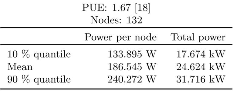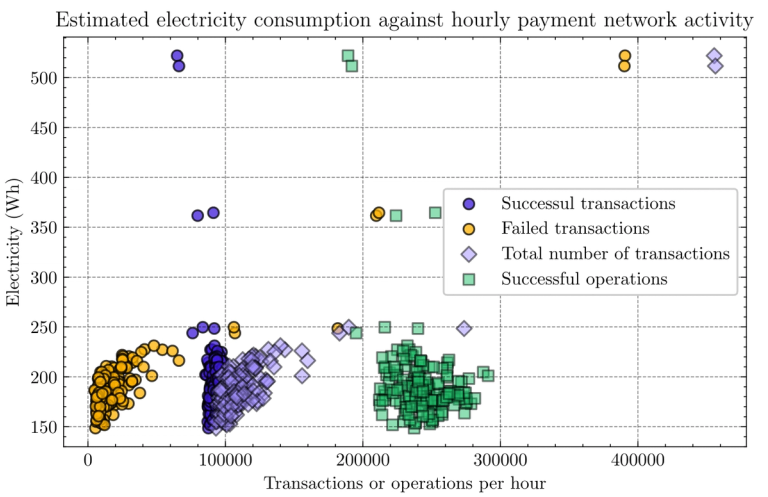 Finalmente, teniendo en cuenta los resultados anteriores, llegamos a un consumo medio de electricidad por transacción de 0.222 Wh por transacción exitosa, o un consumo de energía total medio de 186.5 W por nodo, o 24.6 kW para toda la red.