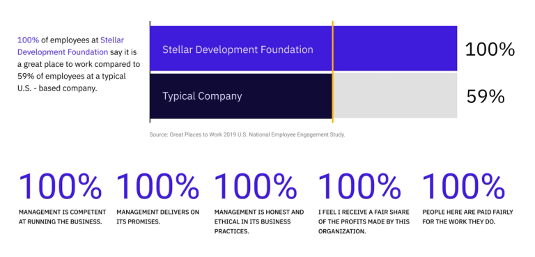 Según los resultados de la encuesta GPtW, “el 100% de los empleados en Stellar Development Foundation dicen que es un gran lugar de trabajo en comparación con el 59% de los empleados en una compañía típica basada en EE. UU.”