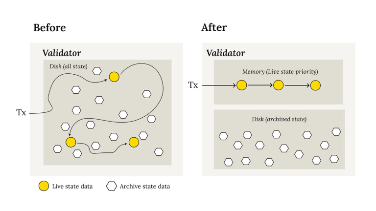 This proposal separates archived state and live state into two separate DBs. While these DBs are still both persisted on disk by validators, optimizing live state access is significantly easier. In particular, live state can be entirely cached in memory, removing disk reads from the Soroban transaction execution path, greatly increasing read limits and throughput.