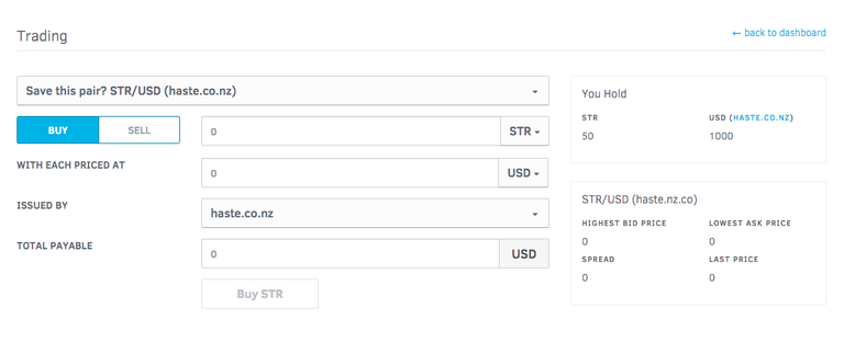Here is an example of how the trading dashboard will appear in the Stellar client. If haste.co.nz-issued USD do not appear in your drop-downs, you will need to complete steps three and four above.