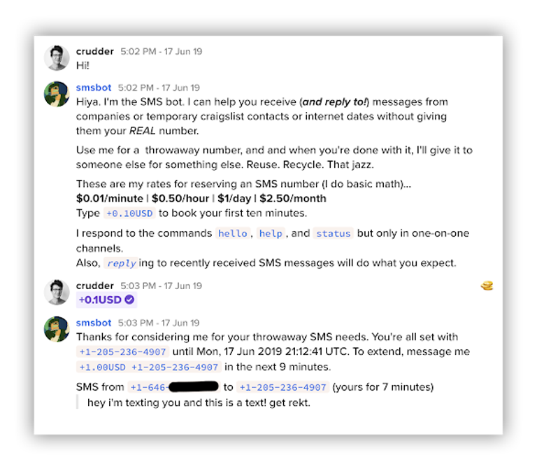 Keybase also has a bot-making framework that, combined with the speed and efficiency of Stellar, makes for a lot of awesome possibilities. Recently, a Keybase user made an XLM-based bot called @smsbot. If you send just a tiny bit of XLM to @smsbot, it will reply with a throwaway phone number you can use to receive SMS messages for a short period of time. It’s a really cool example of micropayments in action, and it’s exactly the kind of thing we hope to inspire and enable with this airdrop.