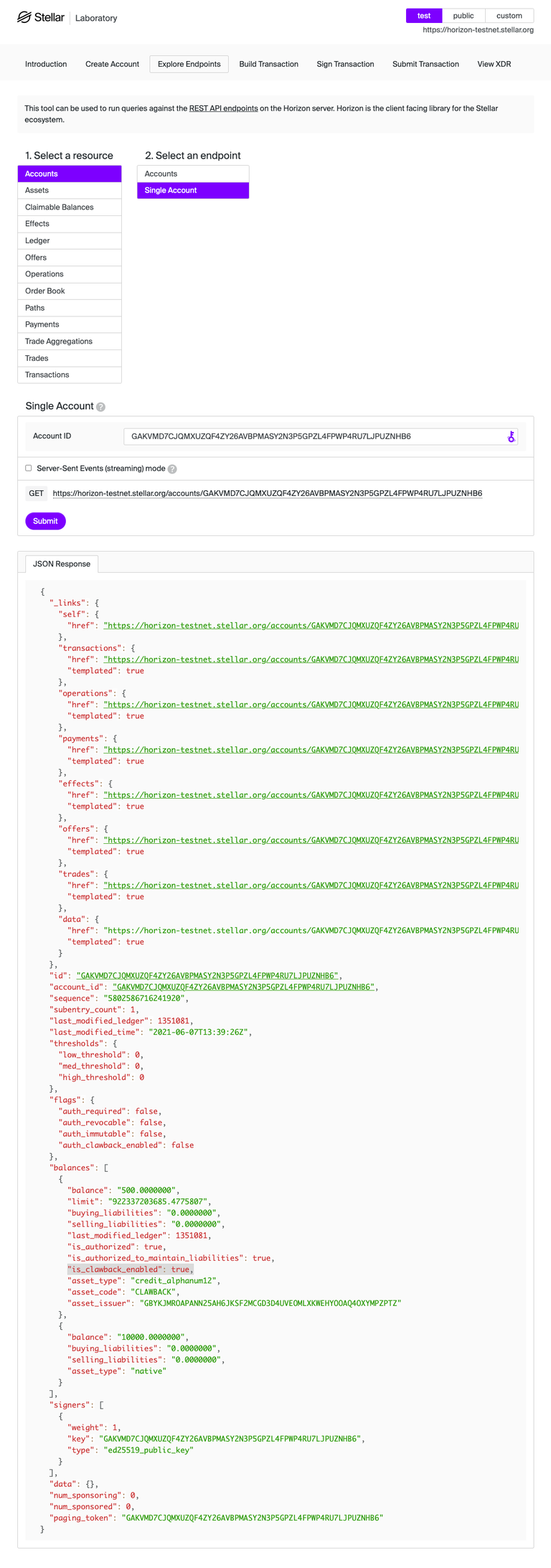 If we look up the Payee account balance now (see highlighted code), we’ll notice it has 500 units of the CLAWBACK asset, and that the trustline is marked as "is_clawback_enabled": true. That flag is fully visible to the Payee.
