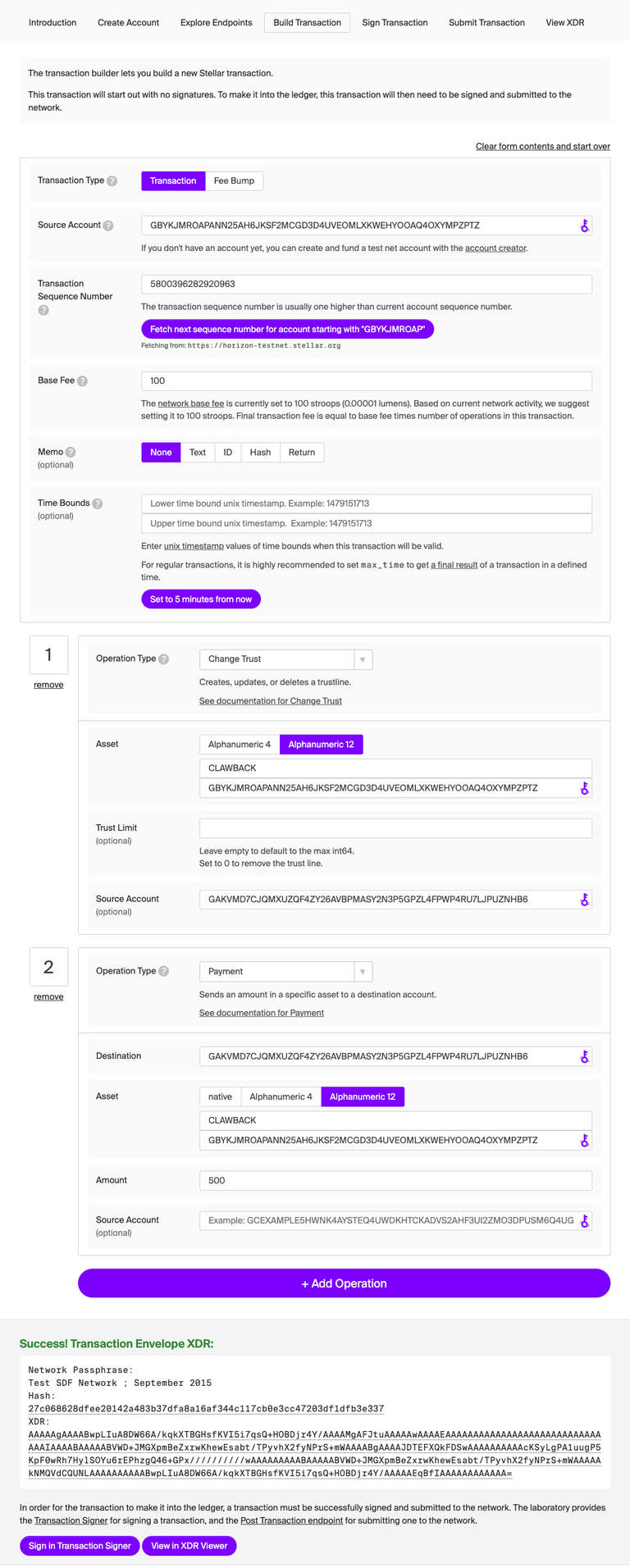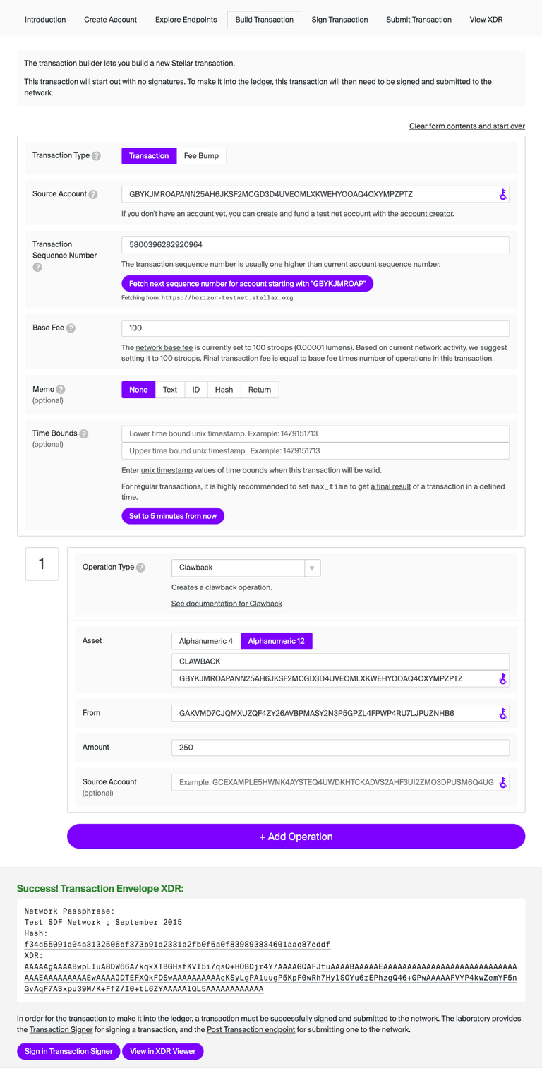 Next, we need to properly set a clawback-enabled flag so any assets issued by this account in the future will be clawback-enabled. We’ll do this in the “Build Transaction” tab.