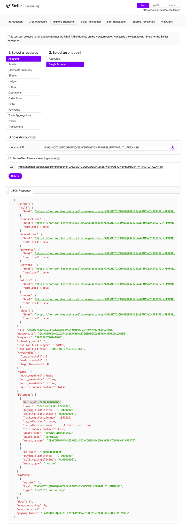 Excellent! Let's make the Issuing account sign and submit that transaction, and then take a look at the Payee account balance to see if it changed. If we’ve done everything right, it should have decreased from 500 to 250 units (see highlighted code below).