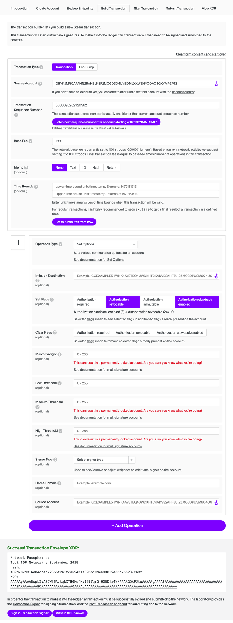 We’ll set the source account to the Issuing account's public key from the previous step, fetch the next sequence number, set our base fee, and finally add a single “Set Options” operation with both the Authorization revocable and the Authorization clawback-enabled flags set.