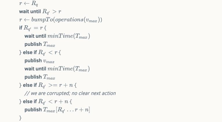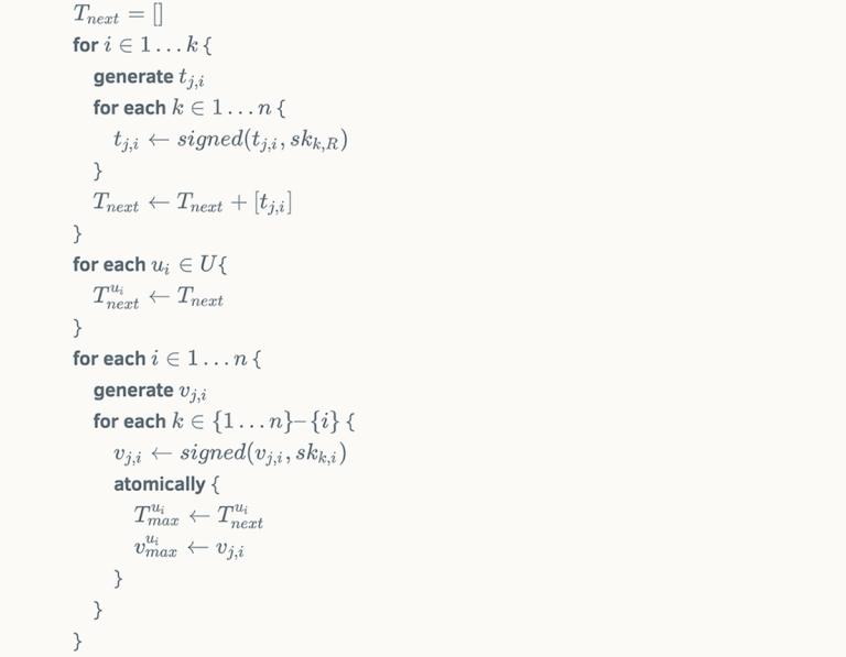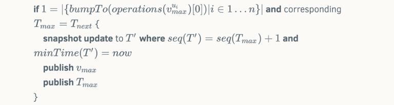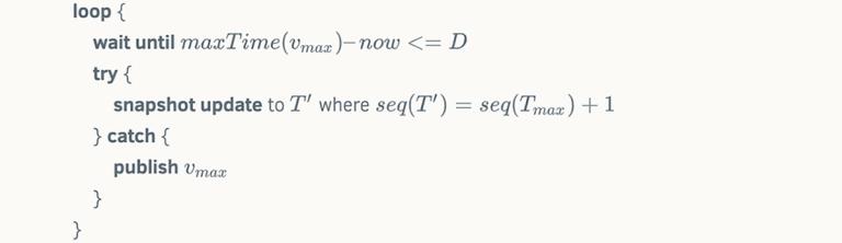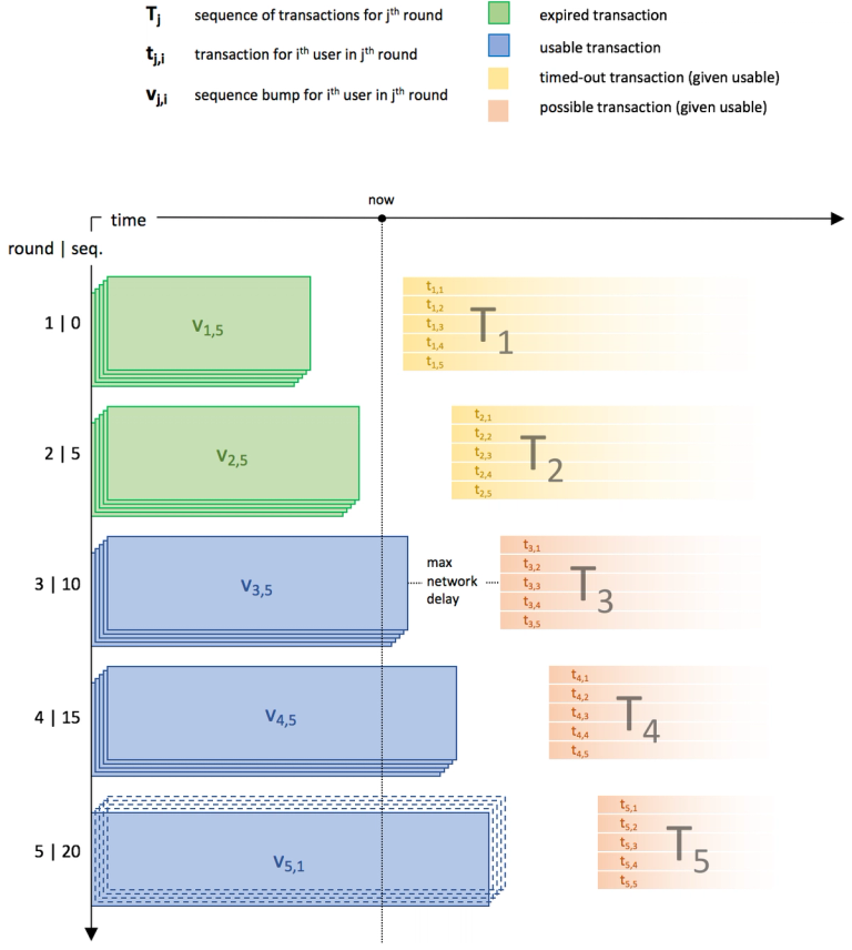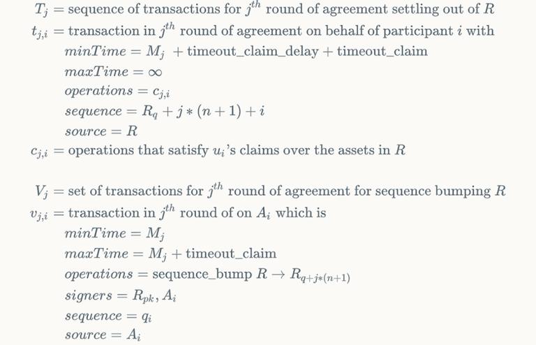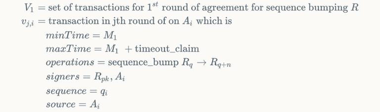 To implement state channels on Stellar, we take advantage of the fact that every Stellar transaction specifies a source account and a sequence number. A transaction’s sequence number must match the monotonically increasing sequence number of its source account. Our approach will be to assign successively higher ranges of sequence numbers on an escrow account R to the transactions in each sequence Tj. The sequence Tj cannot initially execute because its sequence numbers are too high. However, once all users have signed Tj, they go on to sign a second set of "ratchet transactions," Vj, that raise account R’s sequence number to the point at which Tj can execute. Raising R’s sequence number also permanently invalidates the snapshot transactions T_i for i < j ? This is where the synchrony assumption plays in. Transactions in sets Vj and Tj are given time bounds such that the earliest time at which Tj can execute is at least D delay after the latest time at which Vj can execute. This delay allows other users to notice that Vj has been submitted and counter by submitting Vk, thereby ensuring Tk can be executed and Tj cannot.